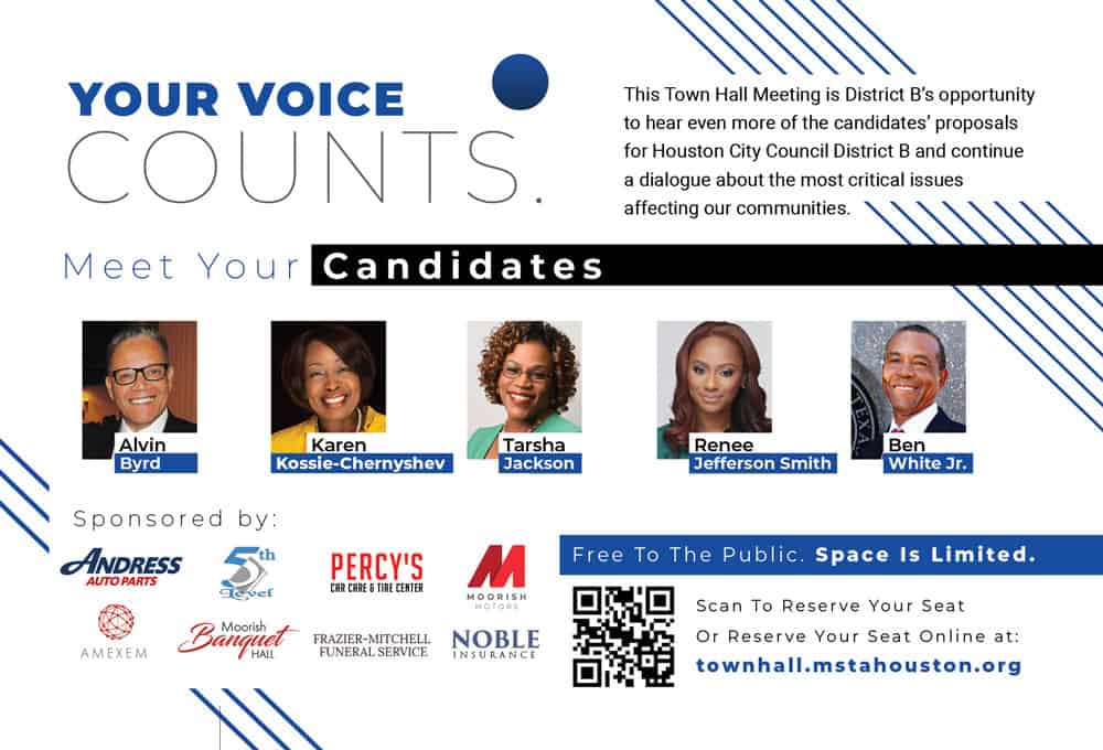This Town Hall Meeting was District B’s opportunity to hear EVEN MORE of the candidates’ proposals for Houston City Council District B and continue a dialogue about the most critical issues affecting our communities.